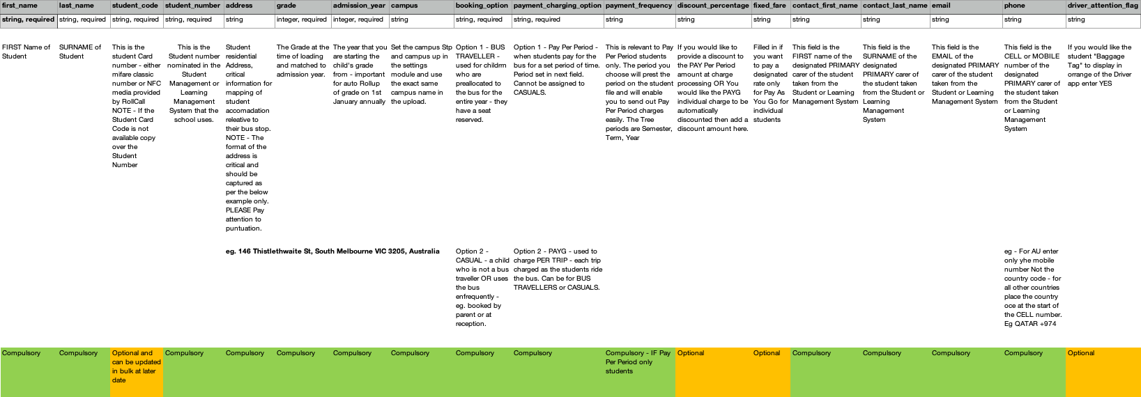 - *booking_option – “CASUAL” or “BUS_TRAVELLER” are the only valid entries. All students will be loaded as CASUAL by default if left blank.