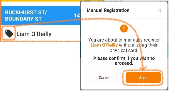 Tap the "tag" icon and select "Scan" to manually scan the student or "Cancel" if required. This is the same process for manually registering students ON and OFF the bus
