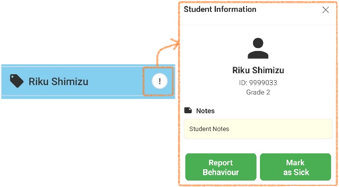 Student Information: If notes have been added when tapping the exclamation mark → the Student notes will display.