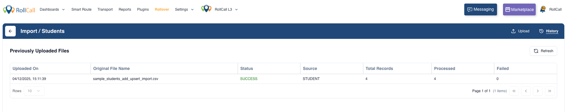 - Check the 'History' tab of the Bulk Upload feature to confirm the status - 'Success' or 'Failed' - of uploaded records.