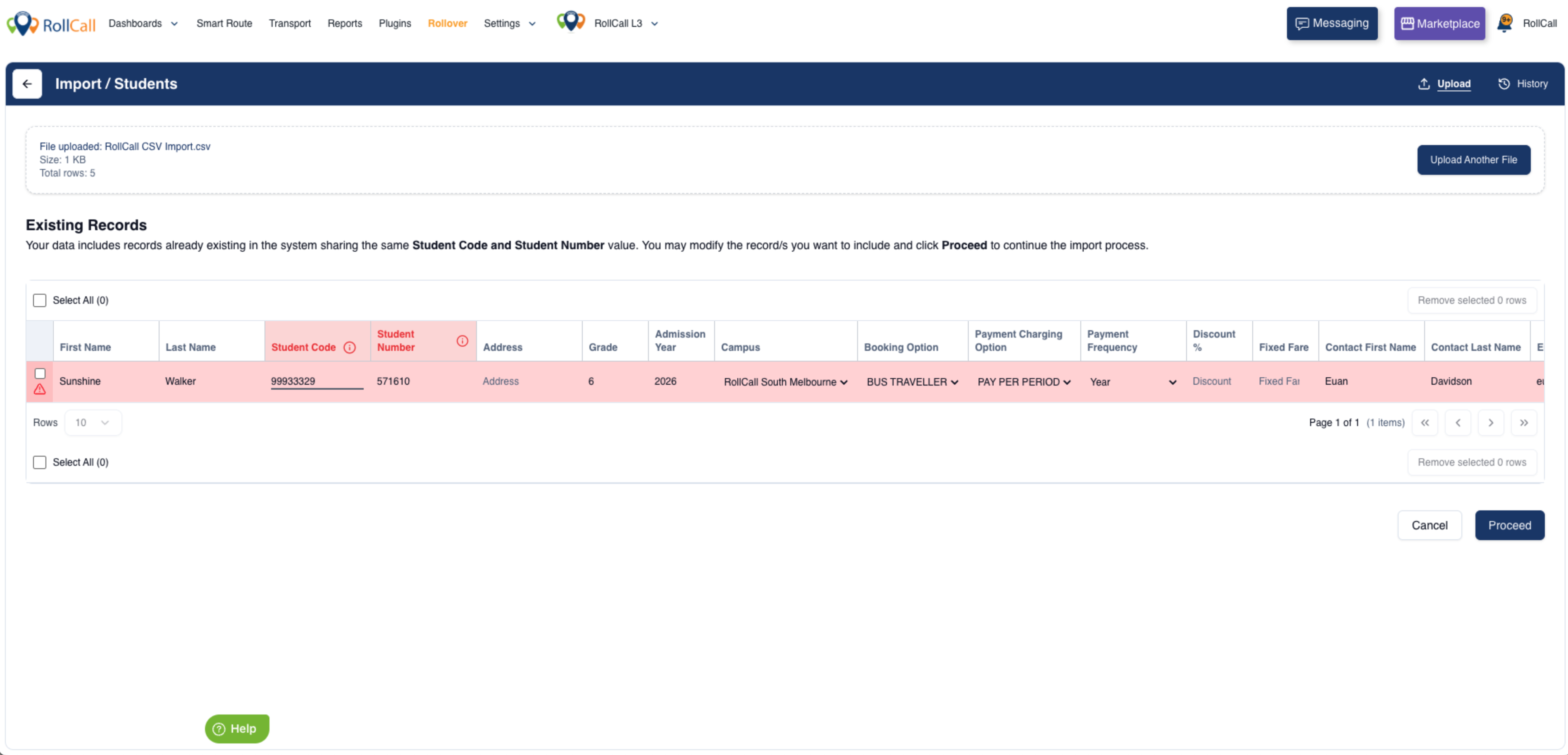 *The RollCall system identifies a record as unique using the Student Number and Student Code