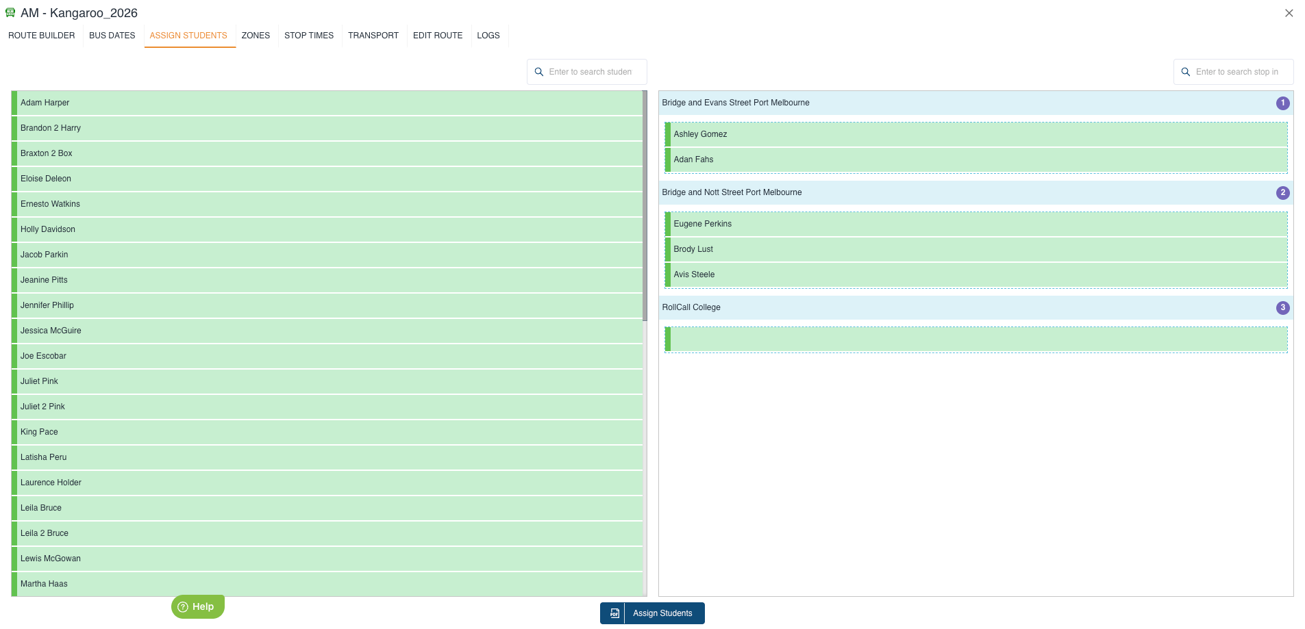 - Drag the students from the left panel into the desired stops on the right panel