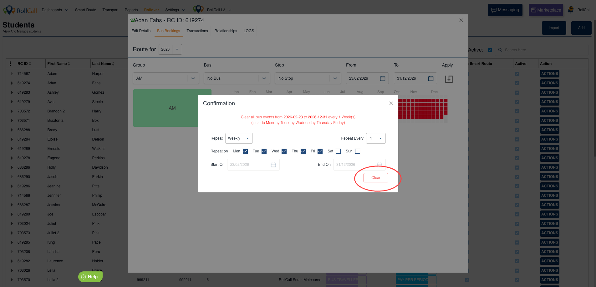 - Select the period to remove the bus bookings from