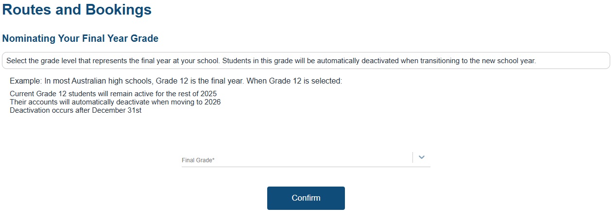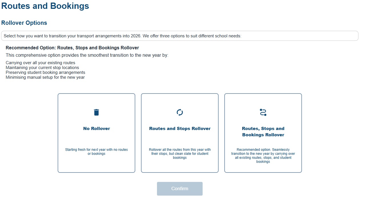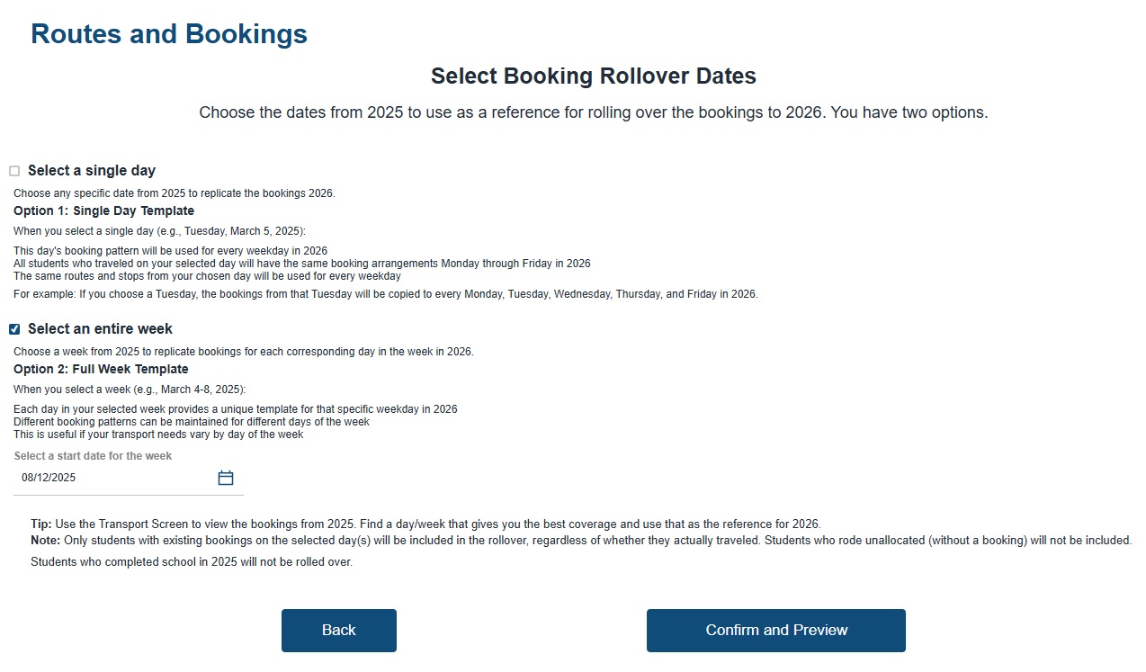 Choose this option if your transport setup will stay the same next year, and you just need to update which students are booked on each route.