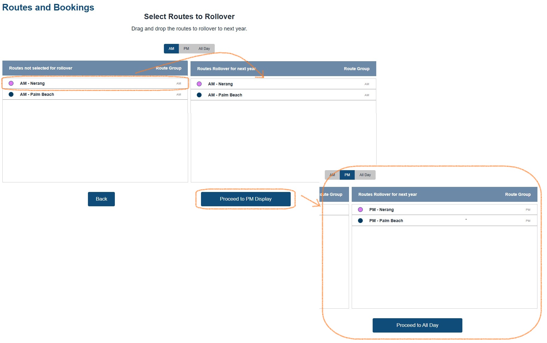 To select routes, simply click and drag them from left to right. Only roll over the routes you want to keep for the new year — if a route is no longer needed, just leave it out.
