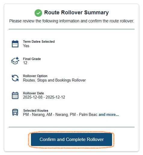 IMPORTANT! Once you click Confirm and Complete Rollover, the routes and bookings will be created — this action can’t be undone!