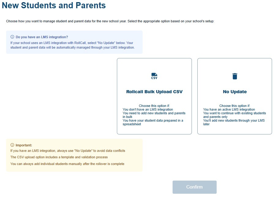 This section helps you decide how to manage student and parent data for the new school year. Choose the option that best suits your school’s setup: