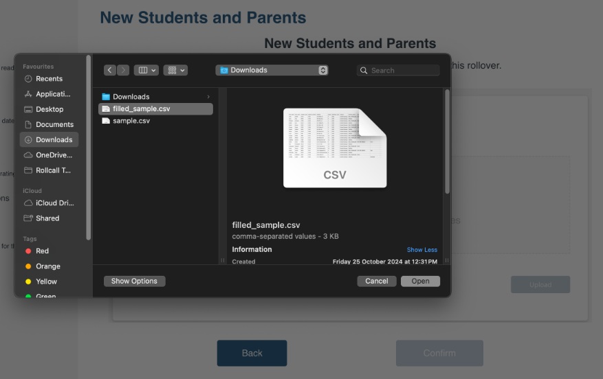 Once your file is ready and correctly formatted, go back to the Bulk Upload CSV section in the RollCall Rollover - New Students and Parents section.