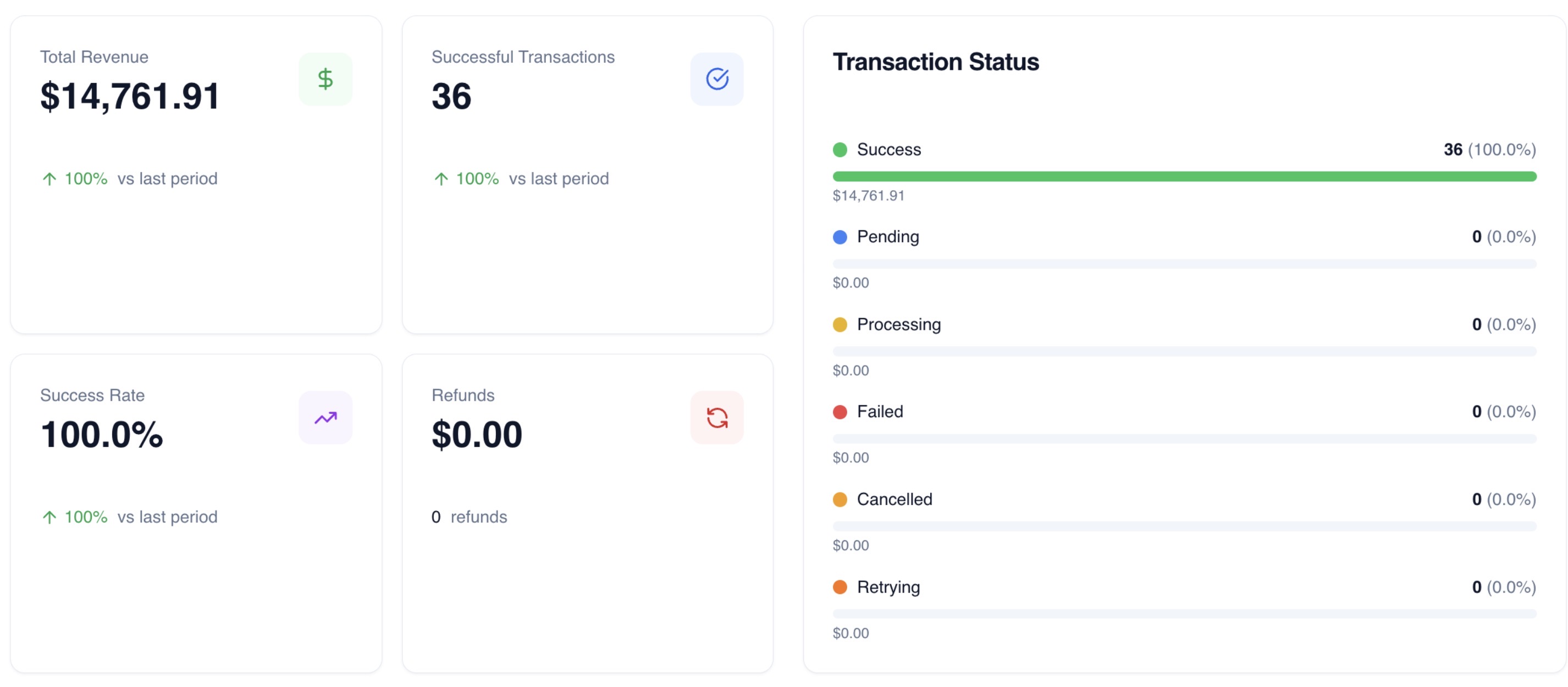 Revenue overview — total revenue, transaction counts, success rate and refunds