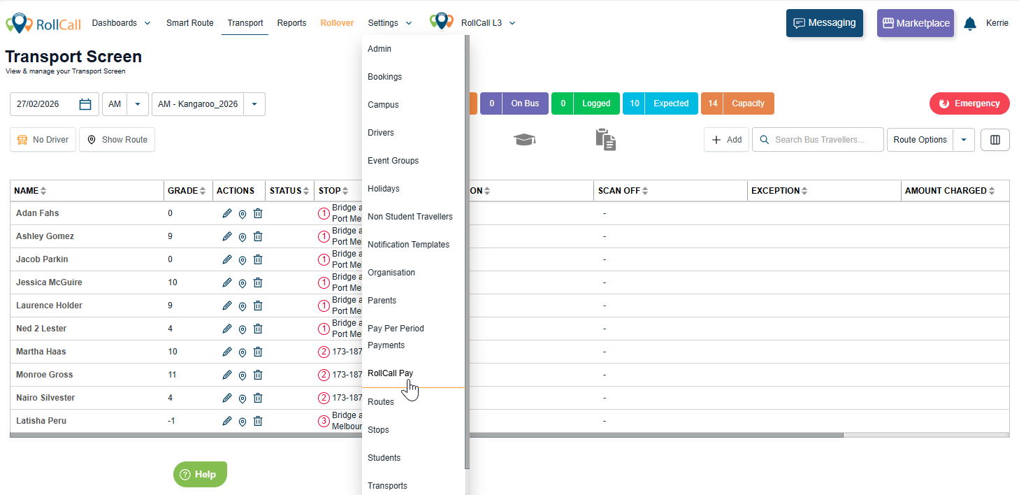 Access the dashboard from the menu option - Settings/RollCall Pay.