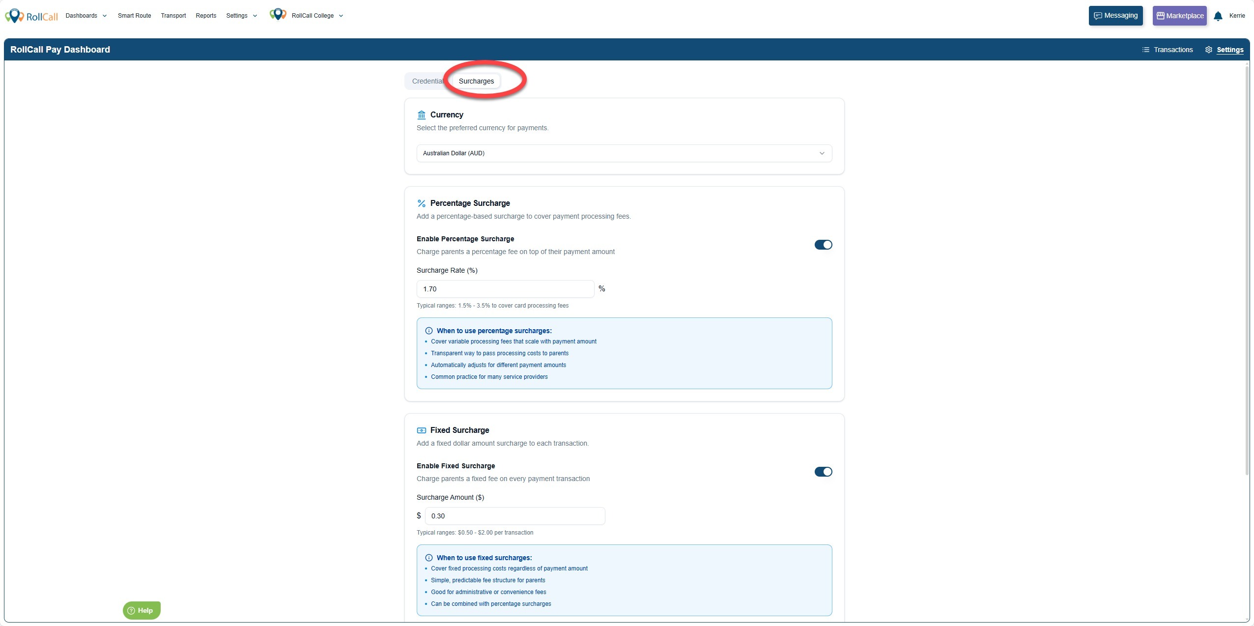 Once you are satisfied with the new surcharge settings, click Save Settings to apply the changes.