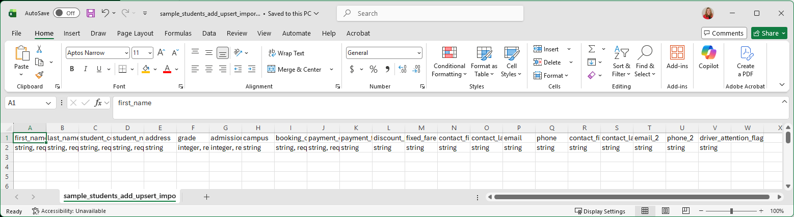 Row 2 is instructional only. If left in the file, it will be treated as student data and will trigger validation errors.