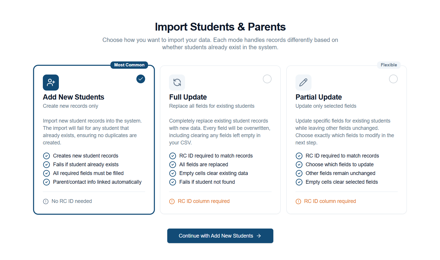 CSV imports for Students and Parents have been improved with a clearer, step-by-step upload process and more control over how data is applied.